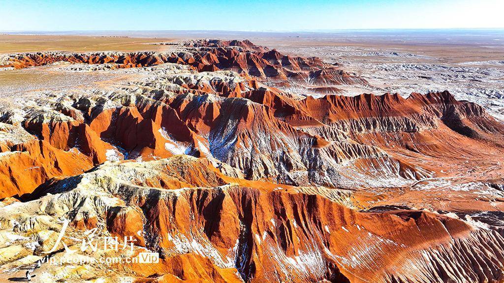 红崖台地位于内蒙古乌兰察布市四子王旗,山体呈现红色,随季节变化深浅交替,为丹霞地貌,南北长约15公里,东西宽约10公里,当地人称“大红山”,是四子王国家地质公园的重要组成部分。隆冬时节,雪色点缀下的红崖台地色彩浓烈,景色壮美。王正摄(人民图片网)
