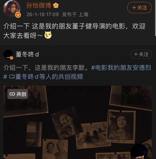 1月18日,孙怡罕见的在社媒上转发了董子健的一条微博,是他作为导演拍摄的电影《我的朋友安德烈》即将上映。